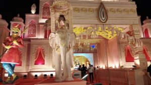 आकर्षण और सुरक्षा व्यवस्था :–पंडाल की भव्यता दूर से ही लोगों को आकर्षित कर रही है। इसे सजाने के लिए आकर्षक विद्युत सज्जा की गई है और निर्माण में इको-फ्रेंडली सामग्री का उपयोग किया गया है। सुरक्षा को लेकर 28 गार्ड तैनात किए गए हैं और पूरे परिसर में सीसीटीवी कैमरे लगाए गए हैं। साथ ही जगह-जगह अग्निशामक यंत्र भी उपलब्ध कराए गए हैं।